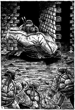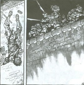 If you don’t believe me, here are some more pictures: the first is of Leonardo presenting the corpse to his brothers (after which they actually cremated it on a wooden pyre), and the second is another instance of them killing him (after the original Shredder was cloned by worms or something), by knocking him off a building, after which they went down, and upon seeing his scattered/shattered/splattered remains, promptly quipped that ‘Shredder’s been shredded‘. To me, these guys sound like fucking sociopaths