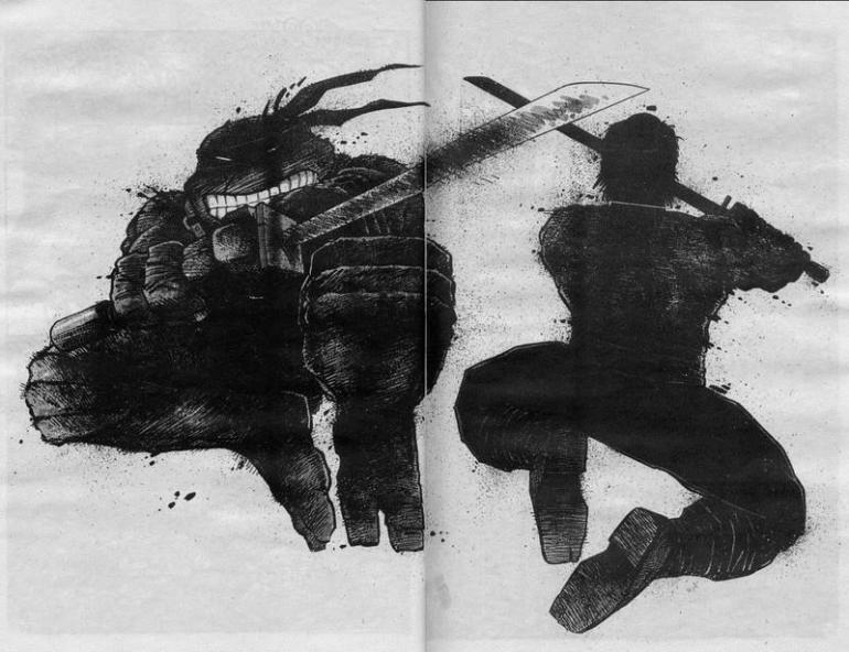 This picture depicts Leonardo actually decapitating Shredder, as you see by the thin line across his neck, and the drench of blood across Leonardo’s blade.