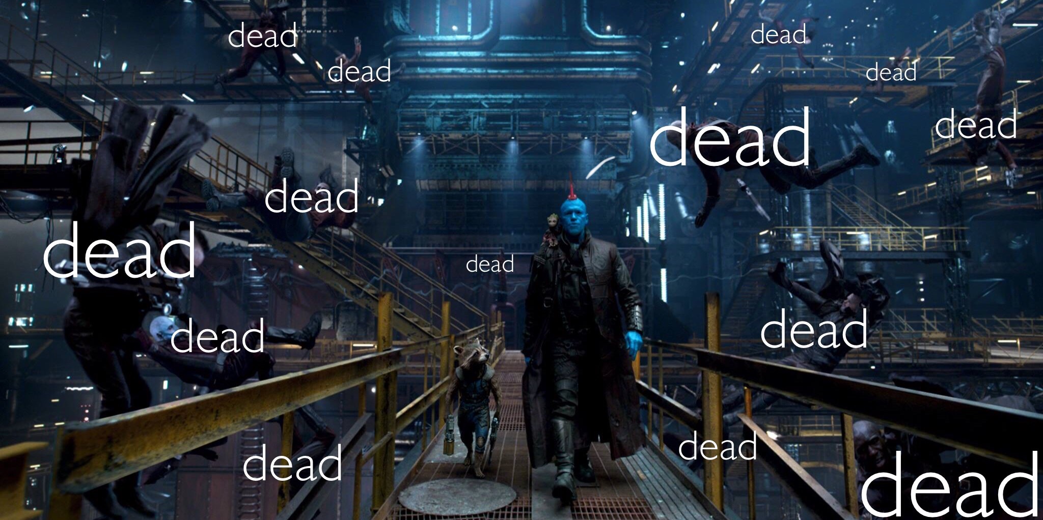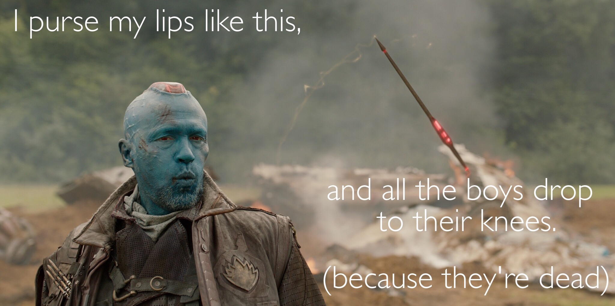 The treatment of Groot (and of Drax and Rocket and everyone else, really) highlights the one single pervasive trend of the entire film: all logic is cast aside for a series of ‘what we think the audience wants’ sketches. Each scene feels so disjointed that you may as well be scrolling through a meme generator. For the sake of set pieces, Rocket can suddenly single handededly kill or maim an entire kill squad of thirty people. Peter will zip around with his jet pack for the whole movie, until he’s suddenly in mortal danger because he apparently lost it at some point and now needs rescuing. Yondu can put on a hat and just slaughter honestly about two hundred relatively innocent (if compared to our ‘heroes’ to whom they’re mostly on an equal moral footing) people while a fun song plays and corpses litter the screen in slow-motion, because it’s a cool set piece and that’s all that matters.