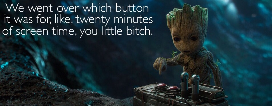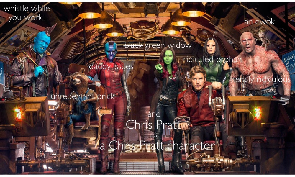 ‘You thought Baby Groot was fun? Great. His cuteness can be the apparent lynchpin of the entire movie. You like how Drax doesn’t get metaphors? Awesome. He’ll just be an innapropriate prick the entire time. You like Rocket being rude and sassy? Fantastic. He will literally be an irredeemable prick to everyone around him the entire time, and then wonder why no one likes him, but surprise, they all still like him because hey man, we’re family. You like the spaceships and the guns and the boom, kkkrrrgh, pew pew pew? Wonderful. We’ll have a totally disposable, no-stakes army going to war in the centre of an exploding planet. You thought Yondu’s murder arrow was cool? Gotcha. That shit’ll be all over the place. You like Chris Pratt being Chris Pratt? Good news. He’s still Chris Pratt.’