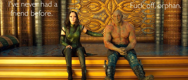 Each popular aspect of the movie is taken out of its former subtlety, and hurled thoughtlessly onto its own pedestal, with no thought to the necessity of its context, and there was just a wealth of examples of how this was an issue. The shtick of Drax was his species is too literal to understand metaphors, so he gets confused by idioms and expressions; but this is totally misconstrued in this sequel, where, instead, he just takes every opportunity to just… be a prick. A running joke of his is to call a socially isolated orphan that they befriend hideously ugly over and over again, because it’s funny that Drax doesn’t understand metaphors. Does it matter that relentlessly insulting a traumatised young girl has nothing to do with metaphor? Nope. Because people loved the bits in the first movie where Drax said funny stuff. No further thought is given to it. The endearing nature of his literal constitution , as seen in the first film, has somehow devolved into a cross between the unfiltered mouthpiece Jim Carrey from Liar Liar, and the mean-spirited racist Jim Carrey from Dumb and Dumber 2.